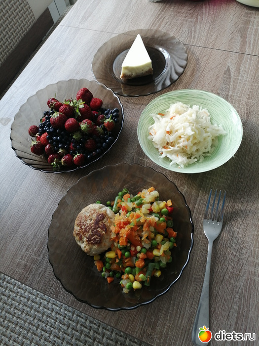 17:00 котлета из индейки, мексиканская смесь, квашеная капуста с маслом, ягоды и чизкейк. Легко я это осилила за раз. Чизкейк у меня низкоуглеводный.