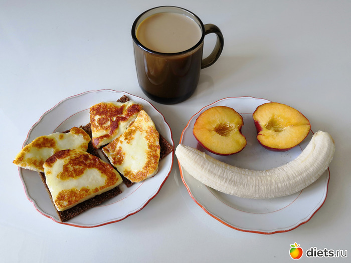 Завтрак: фрукты, хлебцы с жареным сыром, кофе с молоком