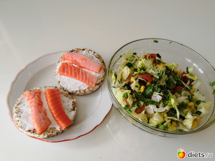 Обед: Воздушные хлебцы с творожным сыром и форелью, салат