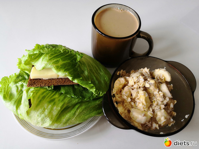 Завтрак: Геркулес с бананом, сухарики ржаные с сулгуни и айсбергом, кофе с молоком