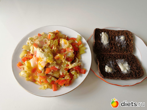 Обед: Яйца с овощами, хлебцы ржаные со сливочным маслом