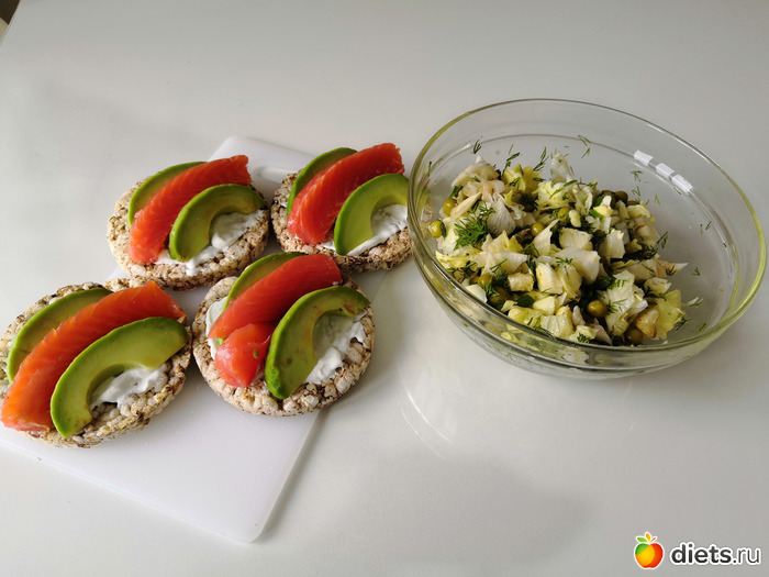 Обед: Воздушные хлебцы с творожным сыром, форелью и авокадо, салат