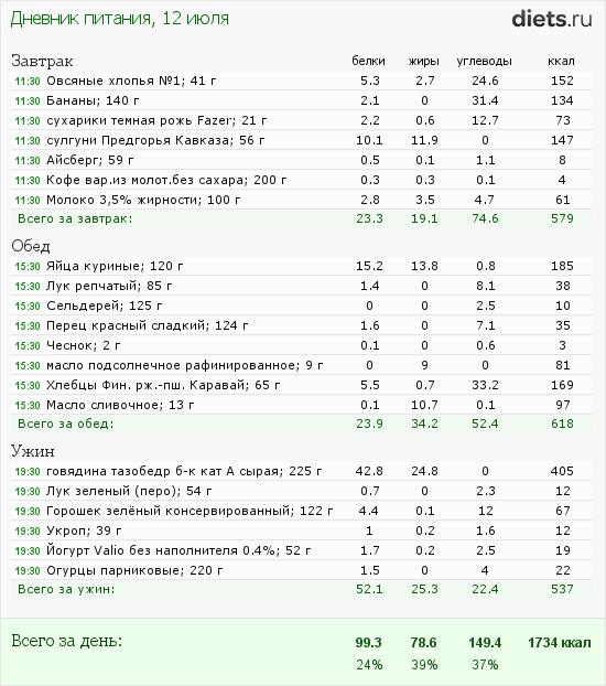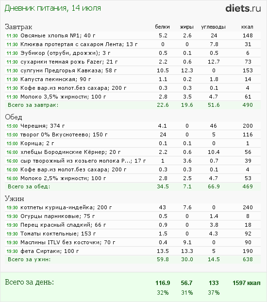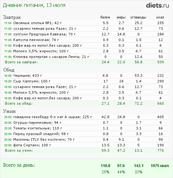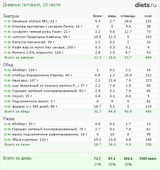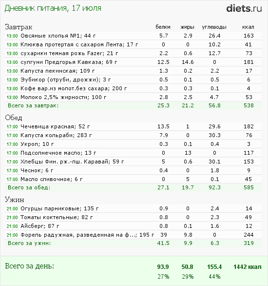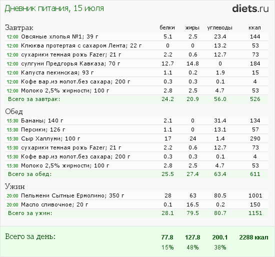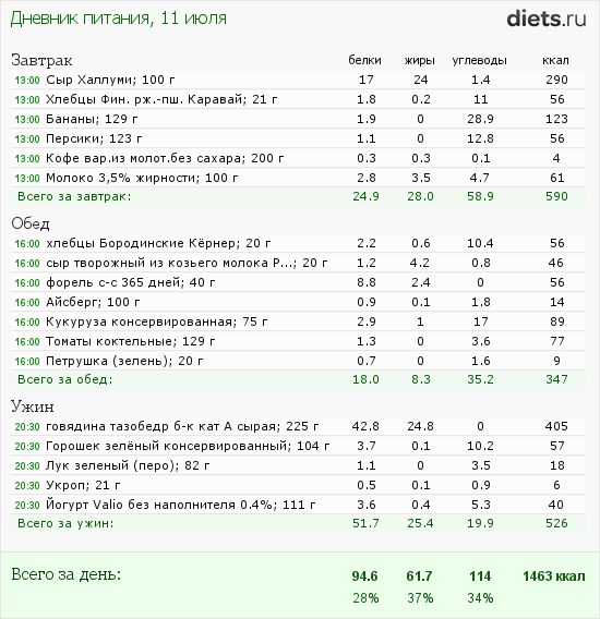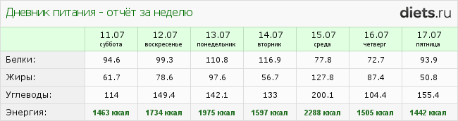 Был в среду неправильный ужин пельменями, т.к. была усиленная работа мозгами, я сильно проголодалась, и не было времени что-то готовить, так как работа продолжалась до поздней ночи. В ход пошли остатки пельменей. В остальные дни вся еда была хорошая, хоть местами и калорийная.