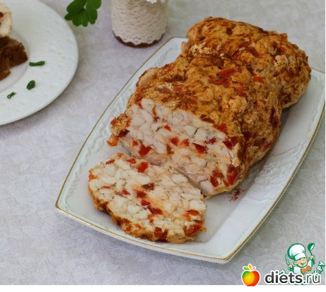 Охладить полностью рулет, периодически переворачивая его, чтобы мясной сок равномерно распределился по всей массе. Снять пакет для запекания, убрать излишки застывшего сока, сверху посыпать рулет сладкой паприкой. Хранить в холодильной камере. Перед подачей нарезать на порционные кусочки. Рулет хорошо держит форму, при нарезке не крошится.