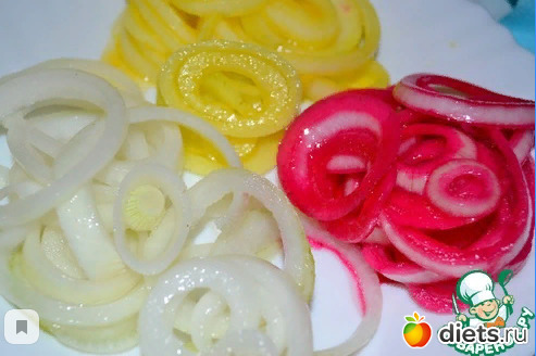 Это скорее всего даже не рецепт, а просто идея как сделать лук разноцветным. Замариновать можно по любому любимому рецепту, но на всякий случай пишу как мариную я. Рецептом этим пользуюсь уже не один год. И вот на сто процентов уверена, что нашла его на "Поваренке" в свое время. Но вот сейчас поиск не дал вообще никаких результатов, я не нашла его не только здесь, но и вообще в интернете. Так что выкладываю его сама, надеюсь, что он пригодится, так как рецепт очень интересный, лук получается не только вкусный, но и красивый.