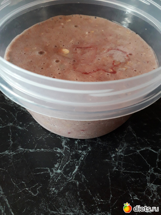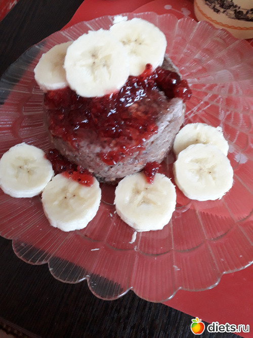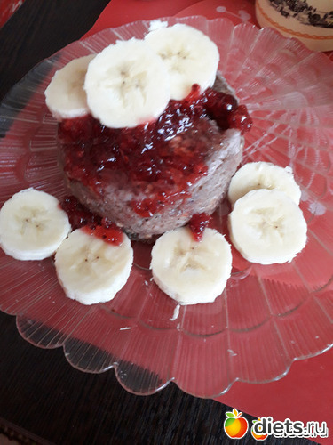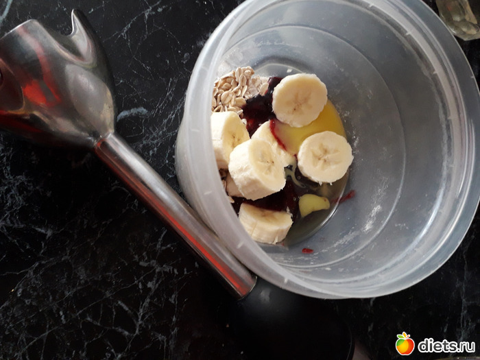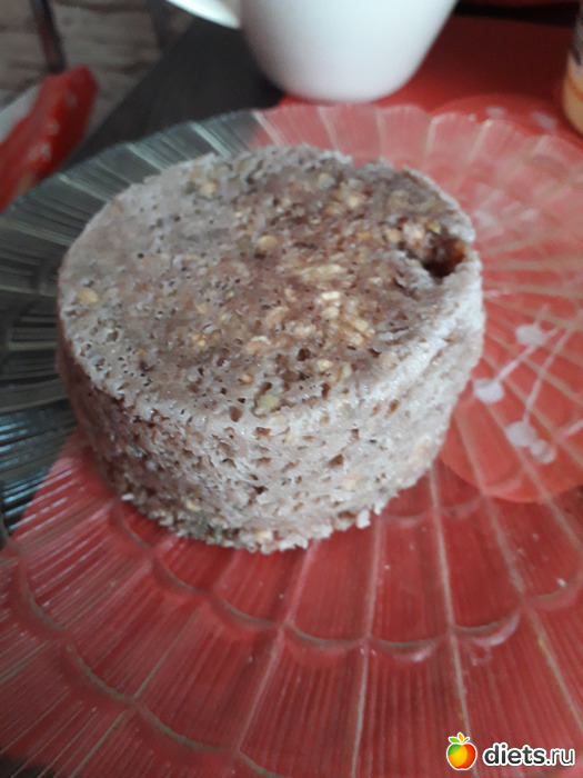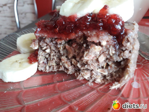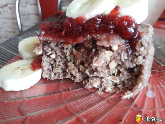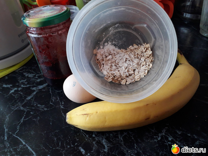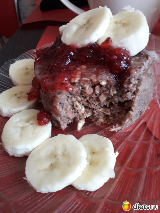 2,5ст.л.геркулеса+1/2 банана+1 яйцо+несколько других фруктов или ягод на Ваш вкус+1/2 ч.л.разрыхлителя-размешать погружным блендером до однородного состояния.. Перекладываем в чашку(у меня форма для СВЧ) и выпекаем! У меня мощность-700-и мне понадобилось 5 минут.(Сергей сказал 3 минуты-не уточняя мощность микроволновой печи).