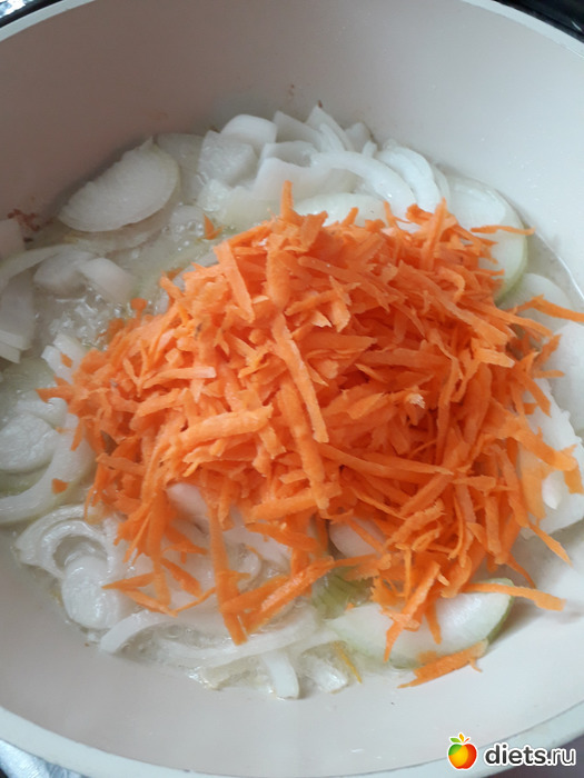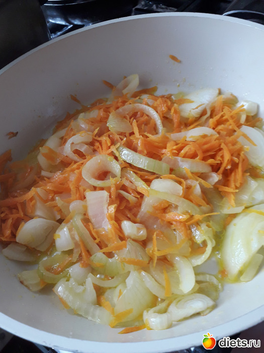 Натираем на терке морковь, режем лук полукольцами и обжариваем их на сковороде под крышкой-до мягкости