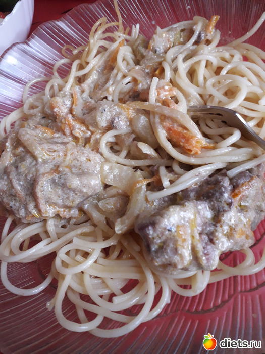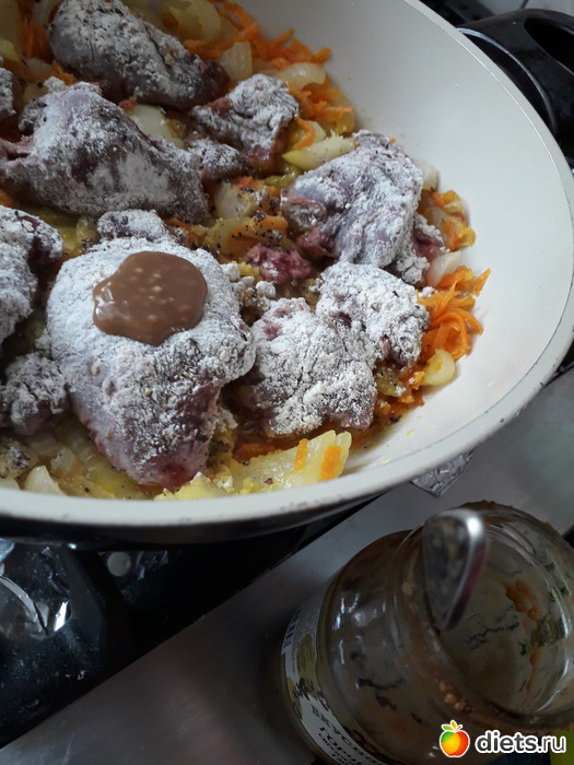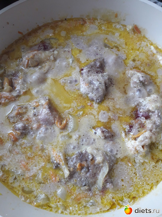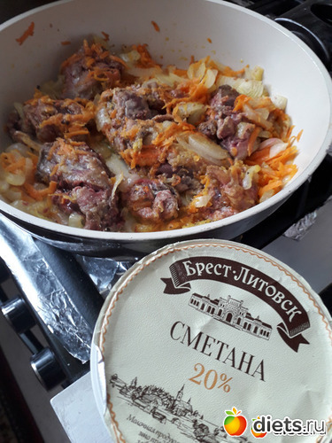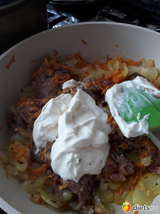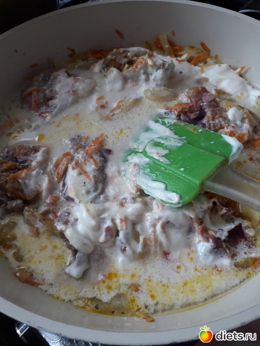 Добавляем сметану, немного воды и тушим порядка 20 минут.