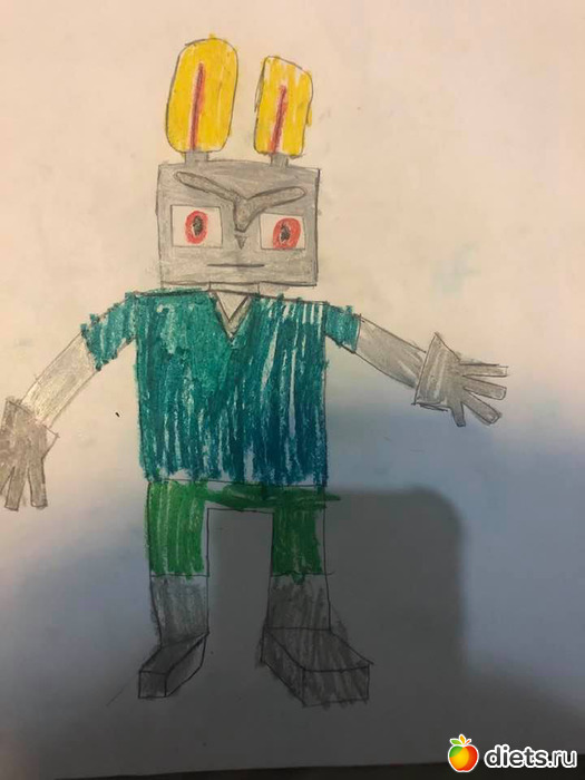 А еще мы смотрели с ребенком Ну погоди, там серия "Заяц-Волк", и под впечатлением сын нарисовал этого Робота-Терминатора