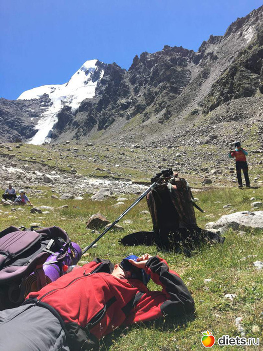Живем в палатках, вполне комфортно. Только там очень не хватает времени на себя, я только книгу успеваю читать перед сном. Про английский совсем уж забыла, тренировки тоже. Хотя они сейчас и не очень нужны, активности хватает. 10000 шагов я делаю до 12 дня)) Питаюсь как хочу, с группой это каши по утрам, на обед суп, вечером второе. Ем хлеб, колбасу и майонез)) Штаны всё равно спадают. У участников были умные часы, которые измеряют всё подряд, так вот, во время восхождения показали расход 3000 калорий!