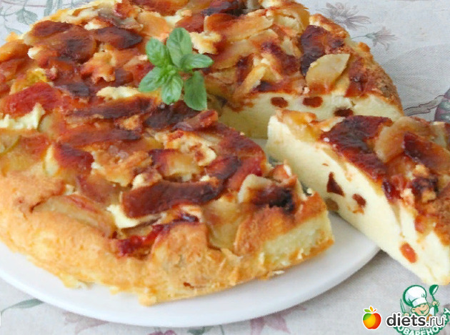 Выложить сверху на яблоки творожную массу, разровнять.