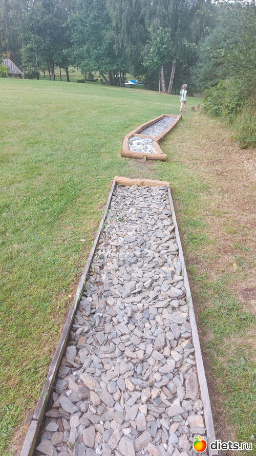 Пройти надо по разным поверхностям: шишки, камешки, галька, песок, мох, еловые иголки, битые стекла