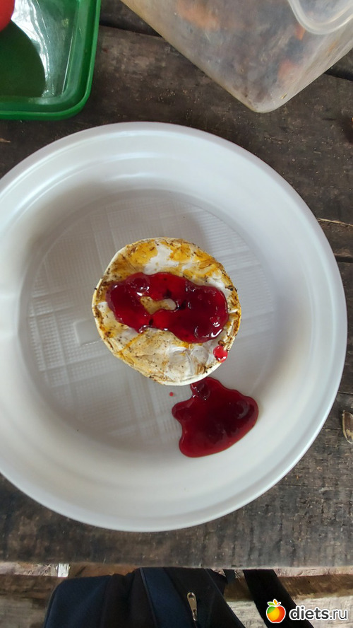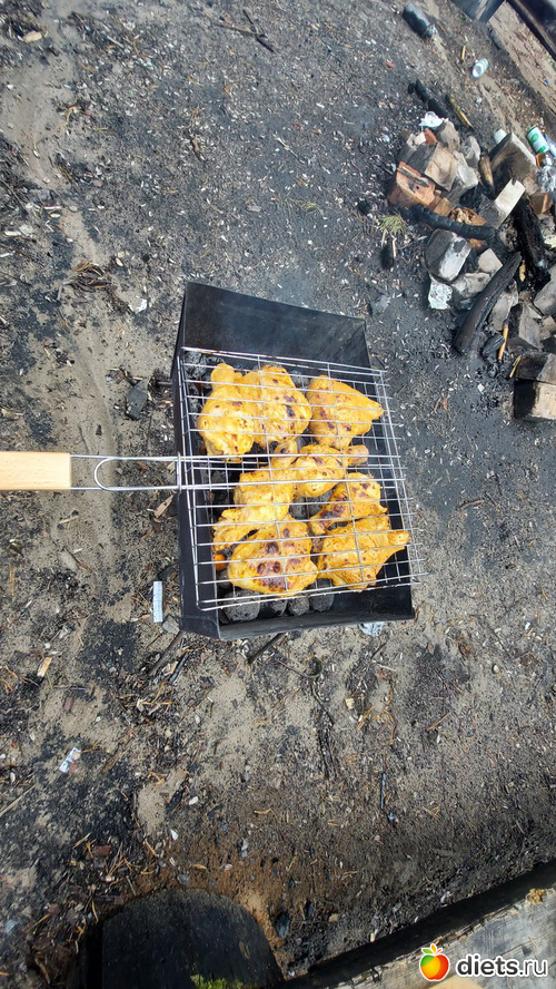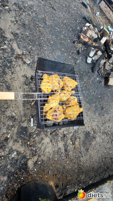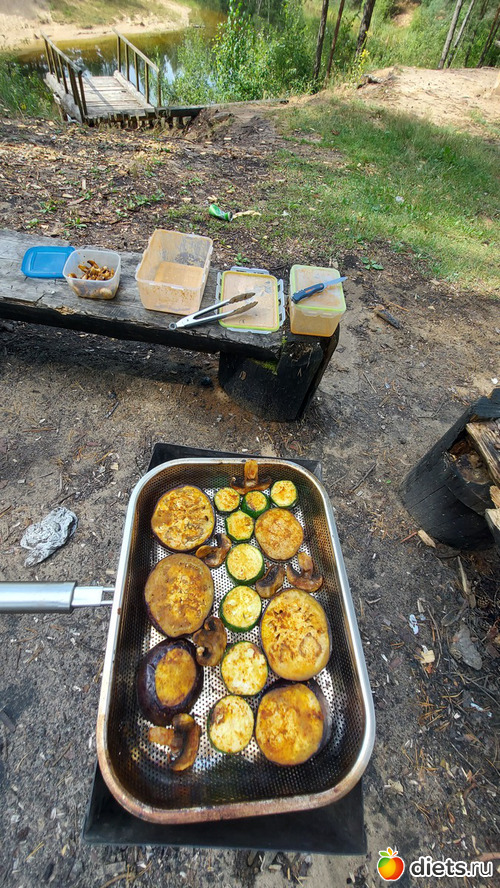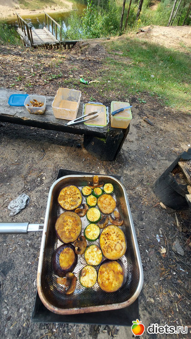 На обед куриные четверти на гриле, кабачок, баклажан, шампиньоны на гриле и свежие овощи. На десерт камембер на гриле с брусничным соусом. Запивали просто водой