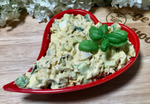 Нужно отварить свежие куриные яйца (5 шт.) вкрутую, очистить их от скорлупы и нарезать на небольшие кубики.
