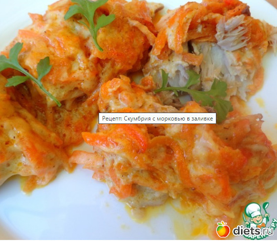 Скумбрия приготовлена в духовке. Морковь и сметано – яичная заливка придают замечательный аромат и обогащают вкус скумбрии.