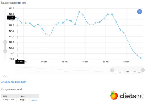 Таким образом, несмотря на недели 16 и 17, которые делали мне нервы, цель августа в 119кг можно считать достигнутой.