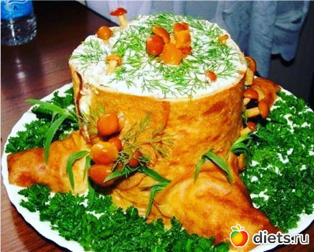 Этот салат я увидела на дне рождения своей подруги и пришла в восторг — красиво невероятно! К тому же вкус потрясающий. Все гости не переставали восхищаться. теперь и я умею делать салат «Пенек». Советую всем научиться и поразить гостей.