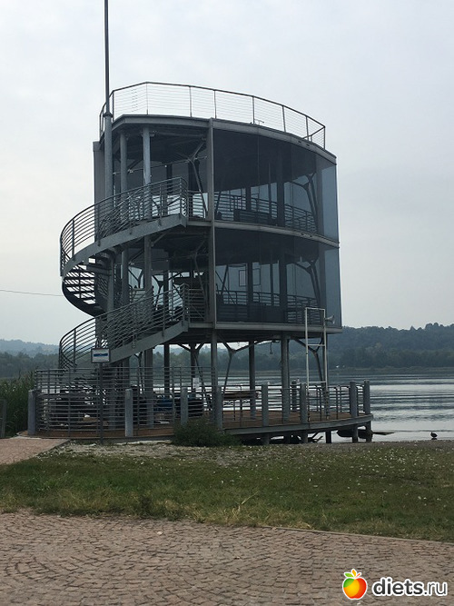 На этой (нашей) стороне тоже тренируются гребцы и есть большая вышка, в которой сидят судьи во время соревнований.