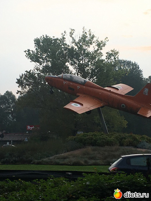 Это памятное для меня место: ротонда с самолетом. Что это обозначает я не знаю, но вот вдали виднеется табличка мясного ресторана "RoadHous".