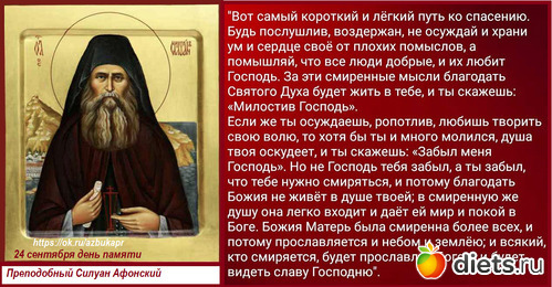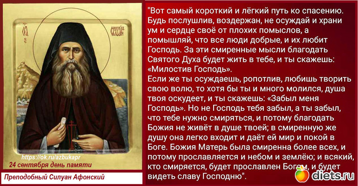 Боже Милосердный, Ты знаешь немощь нашу. Молю Тебя: дай мне смиренного духа, ибо по милосердию Своему смиренной душе Ты даешь силы жить по воле Твоей; Ты открываешь ей все тайны Свои; Ты даешь ей познать Себя и как бесконечно Ты нас любишь. Преподобный Силуан Афонский