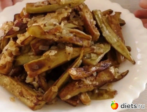 Баклажаны очищаем от кожуры, режем небольшими полосками.