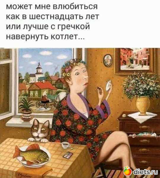 ;Осень шепчет: -Свари спагетти, потуши томаты с чесночком, натри сыра и ешшшш. Еще тарелочку. Это же твёрдые сорта, альденте как душа твоего бывшего, разве с них поправишься? Ну еще ложечку, девочка. Плохо кушаешь совсем. С хлебушком мягоньким семечками посыпанным. Ешшшш! Вино бормочет: -Выпей бокал. Красное вино заменяет кардио. Учёные рази врать будут? Давай плов доедим вчерашний? Пироженка не отстаёт от них: — Открой рот. Это же сахар, полезно для мозга. У тебя такая богатая сексуальная жизнь, два оргазма и минус 800 калорий. Ешшшшшш! На следующий день ты решительная и ставшая еще красивее на полтора кило, вбегаешь в магазин и кричишь: -Я за батутом! Тьфу ты, не то… За кефиром! Кефир бросается к тебе с криками: -Мама, мама пришла! Гречка с полки вопит: -А я? Без меня диета не диета. Мы замочим меня и будем играть в сыроедов. Тут с самой верхней полки на вас пикирует картофельное пюре, багет делает подножку кефиру и падает в ваши объятия первым. Все продукты, а магазине сходят с ума и начинают сыпаться в вашу корзинку. Места хватает всем, кроме кефира. Он рыдает и тянет к вам ручки. И так по кругу. Переедание, диета. Переедание, диета. Диета, диета, срыв. Похудела на пять! Поправилась на семь! А новый год-то скоро. *тайком хрустит чем-то вкусным и это не морковка...