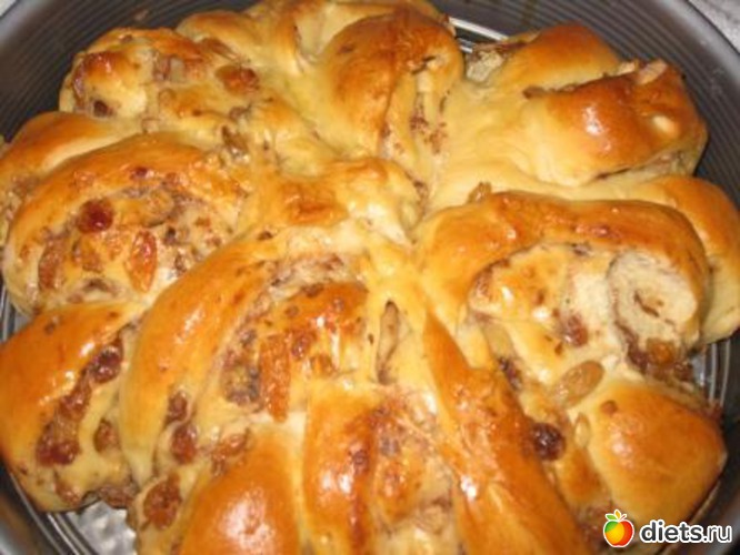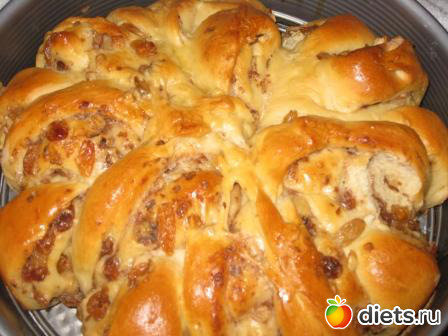 Дрожжи перетираем с мукой в мелкую крошку руками, все ингредиенты перемешиваем и вымешиваем мягкое тесто, которое отстаёт от рук. В конце замеса добавить цедру половинки лимона и ещё раз хорошо вымесить. Ставим в тёплое место на 1 час, затем выкладываем на стол, раскатываем аккуратно скалкой, присыпаем сахаром, снова пройдёмся скалкой, обсыпаем подсушенными измельчёнными грецкими орехами, распаренным, обсушенным изюмом, всё примнём немного ладошками. Сворачиваем тесто в рулет, концы рулета соединяем и защипываем.