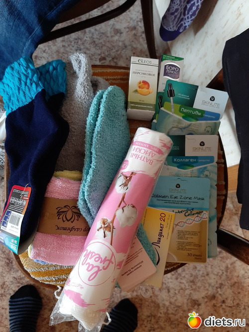 А себе - помимо гилауронки купила пептиды, коллаген, шампунь "Чистая линия" 2 в 1 мицеллярный, кстати, очень классный!!! Ещё 3 пары тёплых носочков махровых, самое то домой на зиму по полам ходить. Базовое масло персиковое, крем "Боро-плюс" - на все случаи жизни, индийский отличный крем, ещё таблеток противозачаточных на 3 месяца, тряпочки махровые маме для кухни. Но она их для папы приспособила.