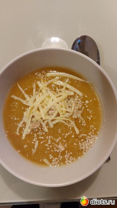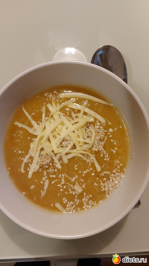 Суп так делаю: в маленьком количестве воды варю тыкву, лук, морковь, под конец добавляю яблоко. Раньше добавляла имбирь, но попробовала как-то раз с яблоком, и мне так больше понравилось. Блендерю блендером и уже в тарелку добавляю кунжут и тертый сыр.