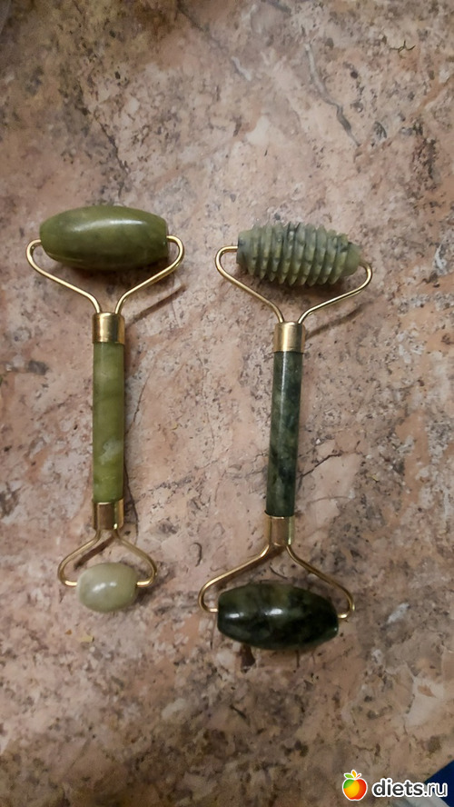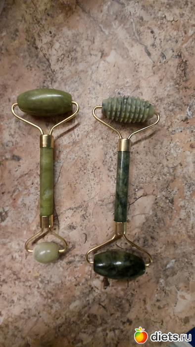 На этой неделе пришла посылка с Али с такими нефритовыми роллерами. Подсмотрела их у Даши Peppermint mood, один купила себе, один маме на подарок. Уже пользуюсь несколько дней тем, что на фото слева. Маленьким размазываю крем под глазами, большим - на остальном лице. Мне нравится