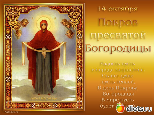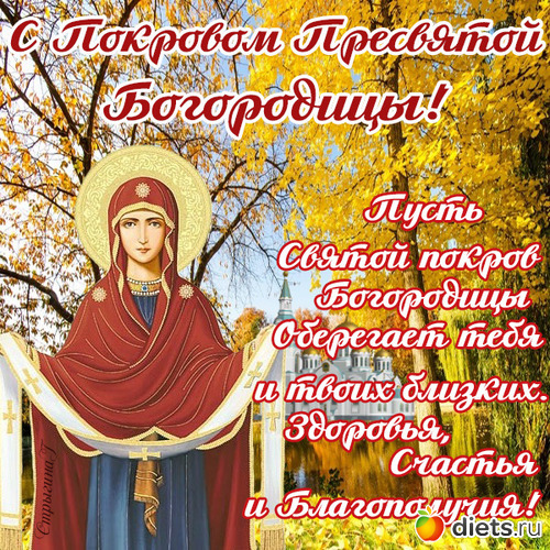 Поздравляю вас и ваших родных со светлым праздником Покровом Пресвятой Богородицы! От всего сердца желаю что бы в этот светлый день ваши молитвы были услышаны Матерью Божией! Пресвятая Богородица укрой всех нас своим покровом. И пусть ни одно на земле горе и несчастье не коснется вас.