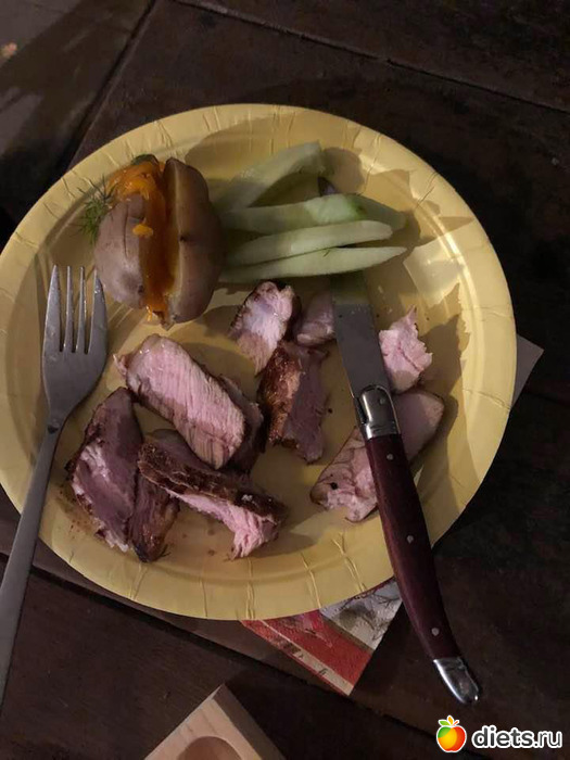 А вечером поужинали на улице. Пожарили вкусные свинные стейки - я замариновала в соевом соусе с медом.