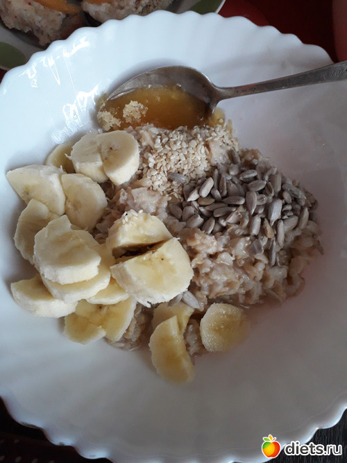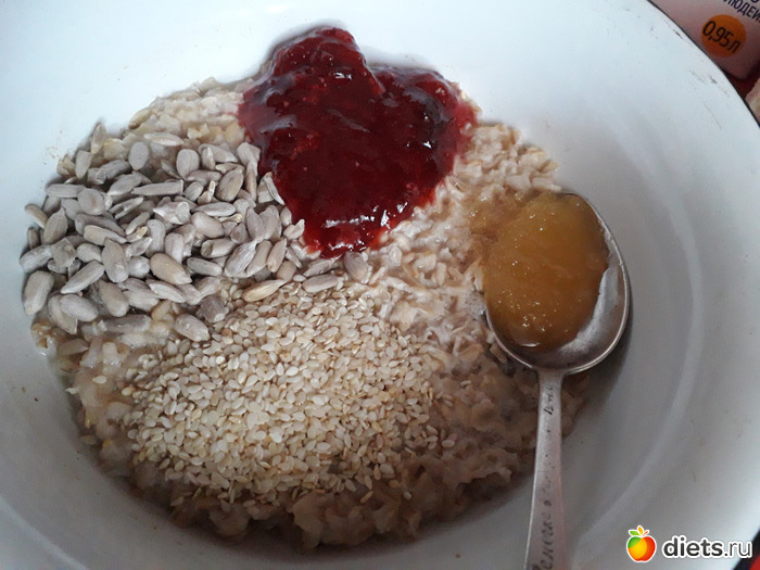 -Геркулесовая КАША на воде, без сахара-соли с семечками, кунжутом, ягодами и медом