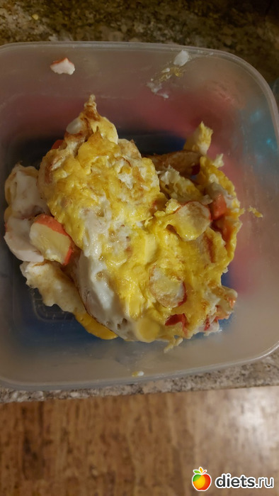 яичница с крабовыми палочками 2 раза (один раз из 3х яиц, показалось многовато, во второй раз из 2х яиц)