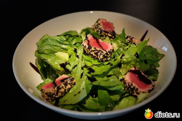 Время приготовления: 20 мин. Для салата нам необходимо взять следующие продукты: Листья салатов: шпината(40гр), щавеля(40гр) и Романо(40гр) Свежий тунец (100гр) Смесь кунжутных семян (20гр) Для заправки: мед (2 ст. ложки), имбирь свежий мелко нарубленный (0,5 ч. л), уксус бальзамический (0,5 ч. л), сок лимона (1 ст. л), чеснок мелко нарубленный (0,5 ч. л), оливковое масло (2 ст. л)