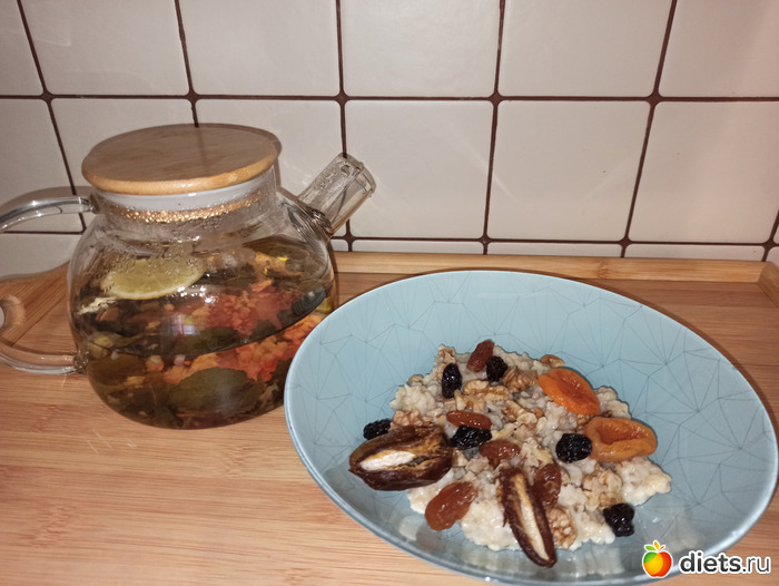 Завтрак: геркулес на воде + сухофрукты + орехи