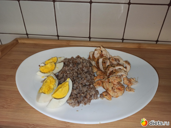 Обед : отбитая грудка в специях + гречка + яйцо ( на самом деле в яйце надо было куру обмакнуть и пожарить