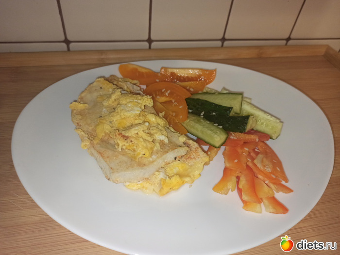 Ужин: отбитая грудка в специях, но уже в яйце + овощи
