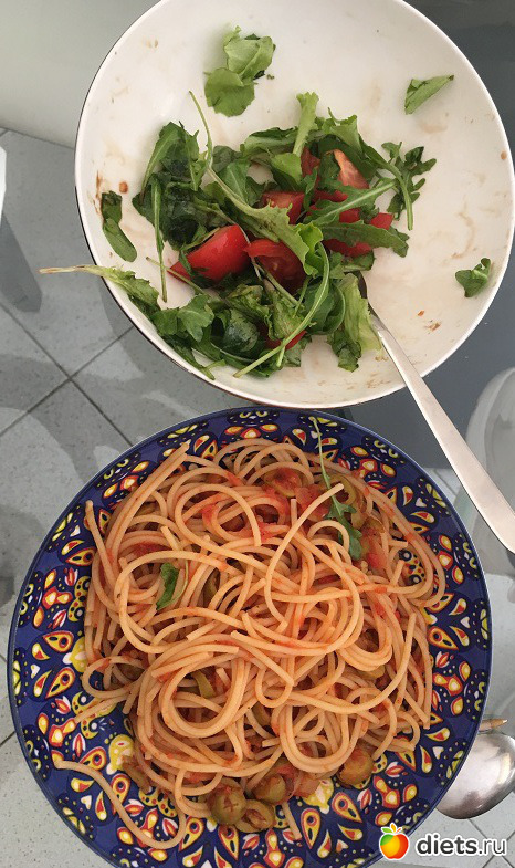 Питание выполнила на 5+. По плану - углеводный день, захотелось так самых простых спагетти с томатным соусом, до жути... Надо сказать, что я обычную пасту с начала сентября не ела, только из бобовых, но она по вкусу совсем не то... Дочь сначала думала отказаться, потом сказала сделать немножко и на ее долю, в результате еще и у меня утащила... Нку правда вкусно получилось. в томаты еще оливок добавила и чесночка... Салатик небольшой, как же без него...