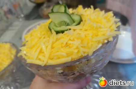 И завершающий слой - натертый твердый сыр. Украшаем по желанию. У меня розочка из огурца.