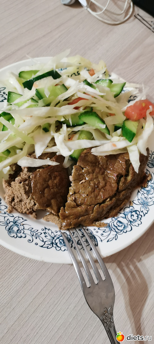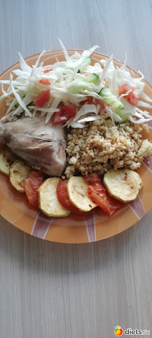 Обед: вареное куринное бедро, кус-кус, свежий салат, запеченый кабачек с помидором