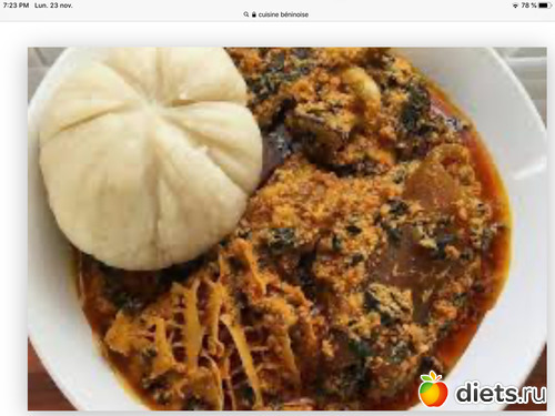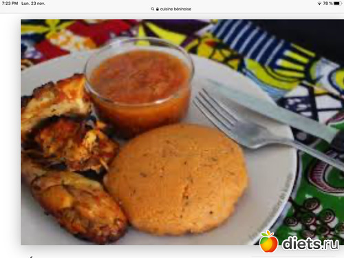Любимая еда местного населения-так называемый пат,который готовится по принципу крутой манной каши.Мука может быть из различных тропических культур-в основном,из кукурузы,сорго,а также из ямса и маниока (это корнеплоды вроде картошки).К пату они готовят различные соусы-арахисовый,сезамовый,из пальмовых орехов,различных листовых овощей на основе мяса,рыбы или курицы