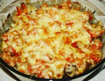 Печень выложить в форму для запекания, посолить, поперчить, посыпать измельченной зеленью и чесноком, сверху выложить слоем нарезанные кубиками помидоры, посыпать тертым сыром, поместить форму в горячую духовку, запекать до расплавления сыра.