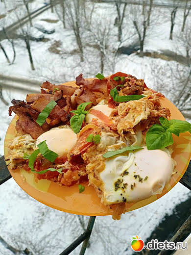 На обед была яичница с луком, помидорами и грудинкой свиной варено-копченой. Я ее на маленькие кусочки нарезала, чуть выжарила, а потом на этом сале вытопленном яйца с овощами поджарила.