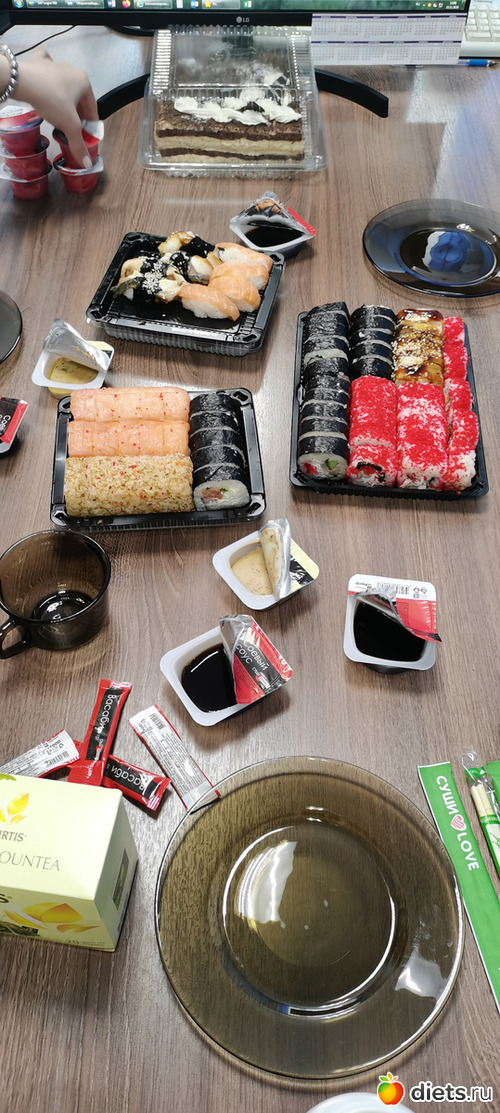 Обед: праздничный (роллы и торт), у коллеги был ДР
