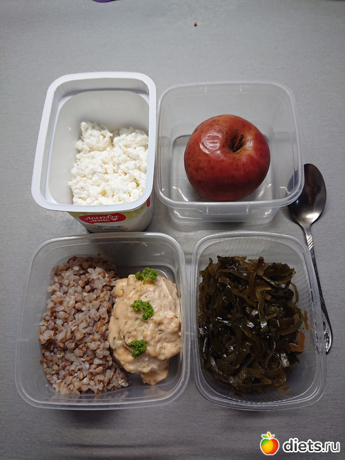 1завтрак-овсянка(на фото отсутствует), 2завтрак творог зерненый 120гр,обед запеченая куриная тефтелька в сметанном соусе(70гр)+гречка 2ст ложки +ламинария 100гр), перекус-запечённое яблочко(сырые не могу кушать желудок не дает((