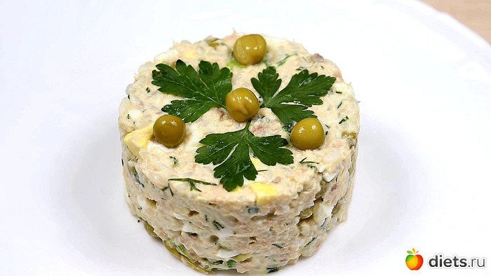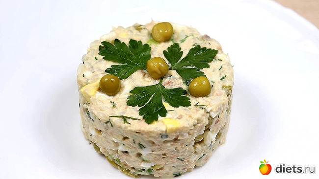 Вкусный и простой в приготовлении рыбный салат из консервированной горбуши с рисом, яйцом и зеленым горошком.