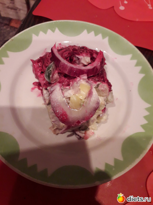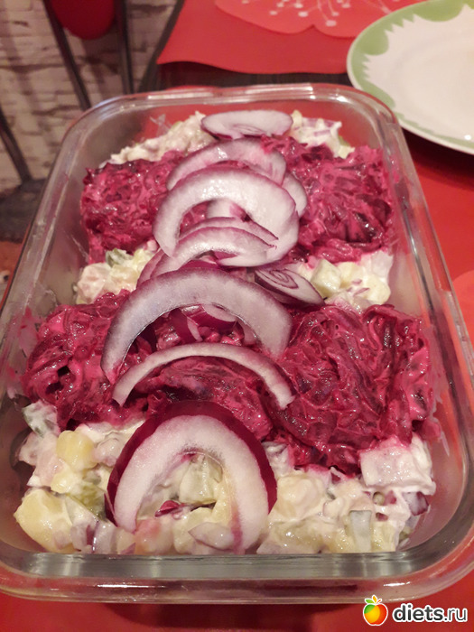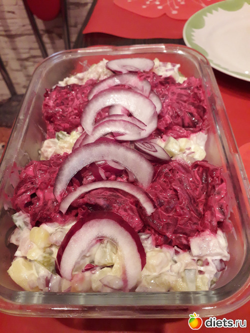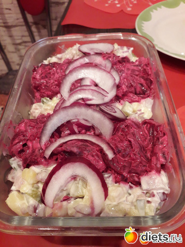 -Выкладываем салат(без свеклы) в прямоугольную форму. При помощи лопаточки раздвинем салат, оставим как-бы пустые полоски и их наполним свеклой. Украсим верх на свой вкус!