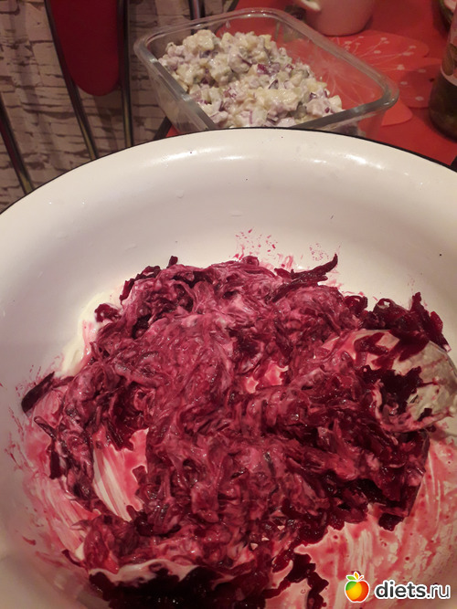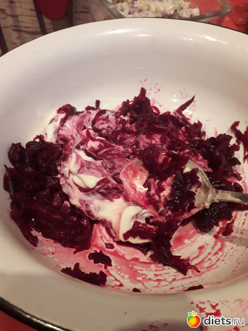 -Потрем свеклу на крупной терке, посолим по вкусу и добавим майонеза-совсем немного. Дадим ей пропитаться!