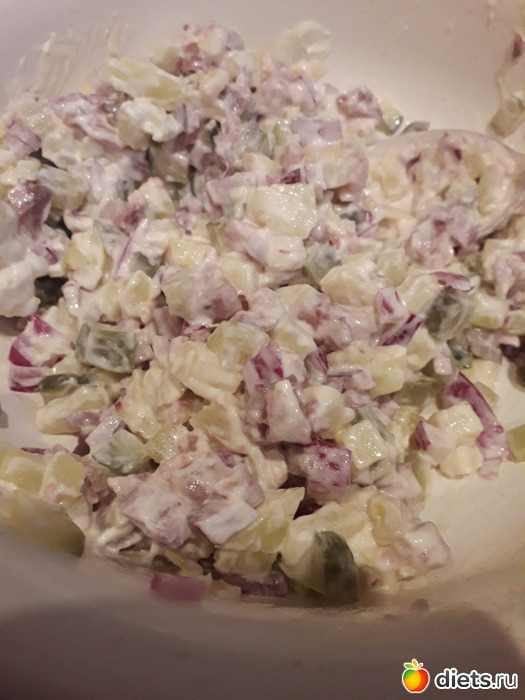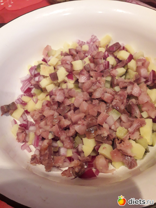 -Нарежем картофель, сельдь, огурец, лук мелкими квадратиками